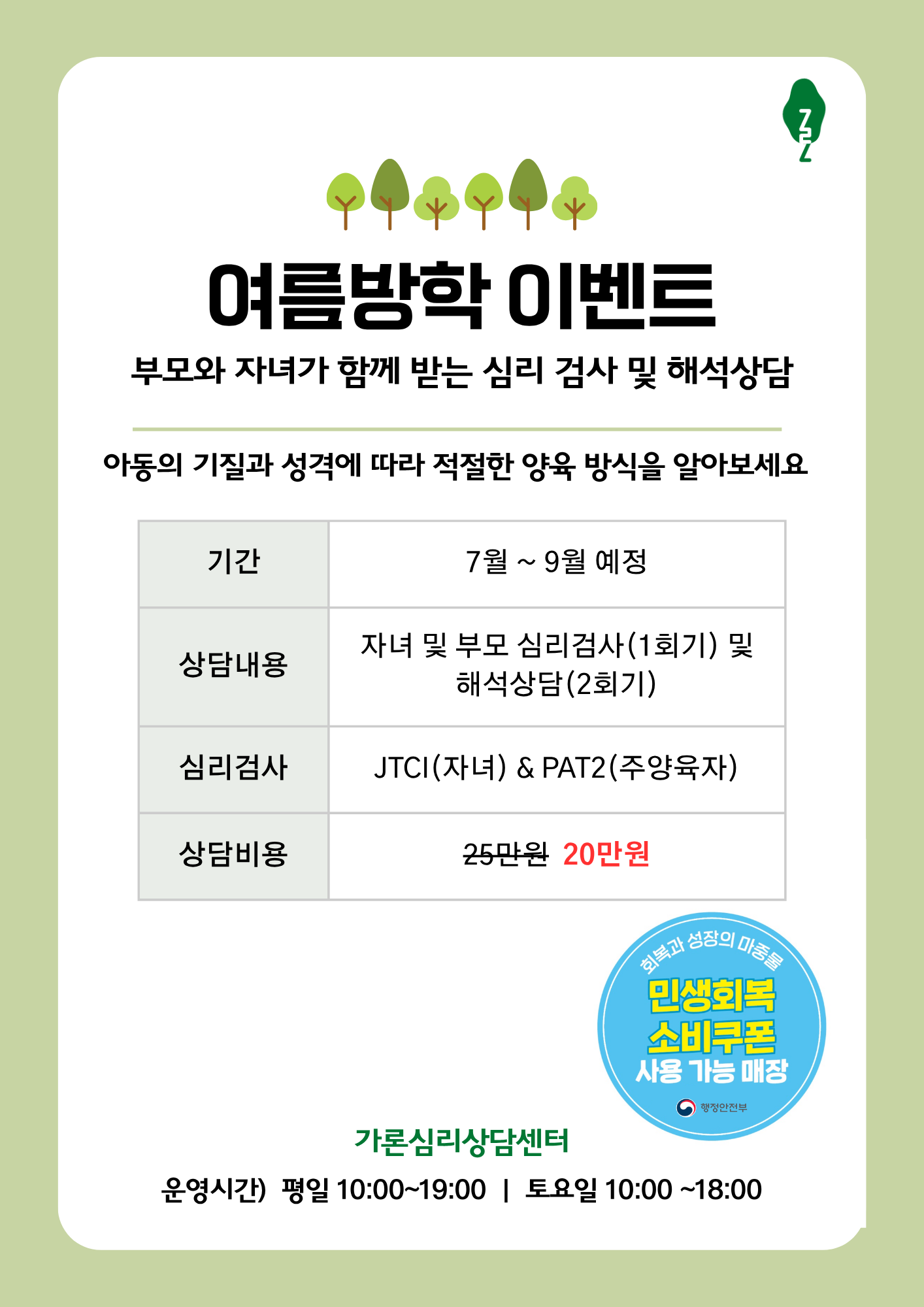 상담내용: 자녀 및 부모 심리검사(1회기) 및 해석상담(2회기)